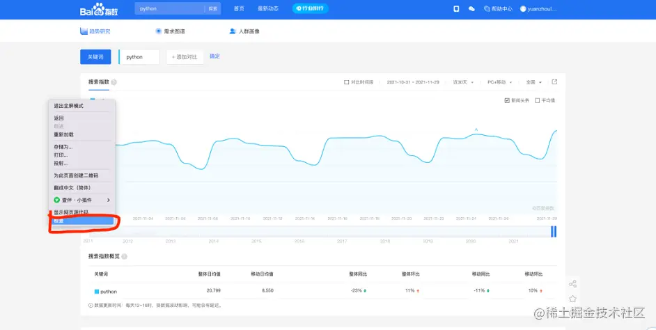 百度指数是需要登陆,进行用户验证,因此,我们要登陆百度指数,然后随便搜索一个关键词,比如Python。然后在网页空白地方,右键打开【检查】,然后进入【网络】